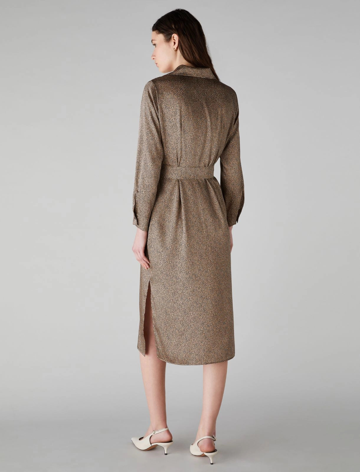 Chemisier Emme Marella maculato in twill effetto satin. Modello sfiancato, con taglio in vita, cintura coordinata per personalizzare il fit. Collo aperto, maniche lunghe con polsino e Chiusura con bottoni a vista. Spacchi alti laterali, tasche inserite ai fianchi. Nuova collezione abbigliamento donna A/I 2024-2025. Codice articolo: GINOSA