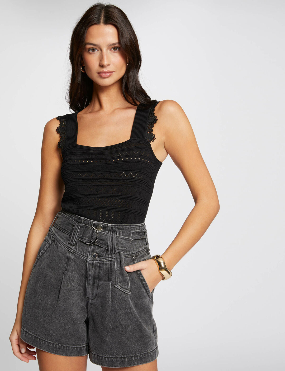 Morgan de toi top corto nero, modello con spalline larghe e scollo quadrato. Dettaglio traforati, carré con effetto macramè e fondo smerlato sulle spalline. Vestibilità regolare. Nuova collezione abbigliamento donna P/E 2024. Codice articolo: MNOA